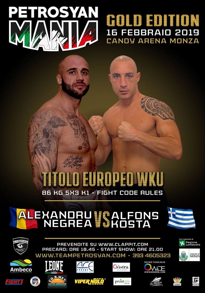Στις 16/2, στη Monza της Ιταλίας, και σε μια από τις σημαντικότερες μάχες του PetrosyanMania-Gold Edition, ο Αλφόνσο θα αντιμετωπίσει τον σπουδαίο Ρουμάνο kickboxer Alexandru Negrea, σε έναν αγώνα 5 γύρων των 3’, για τον Ευρωπαϊκό τίτλο της WKU στα -86kg με όρους Κ1.