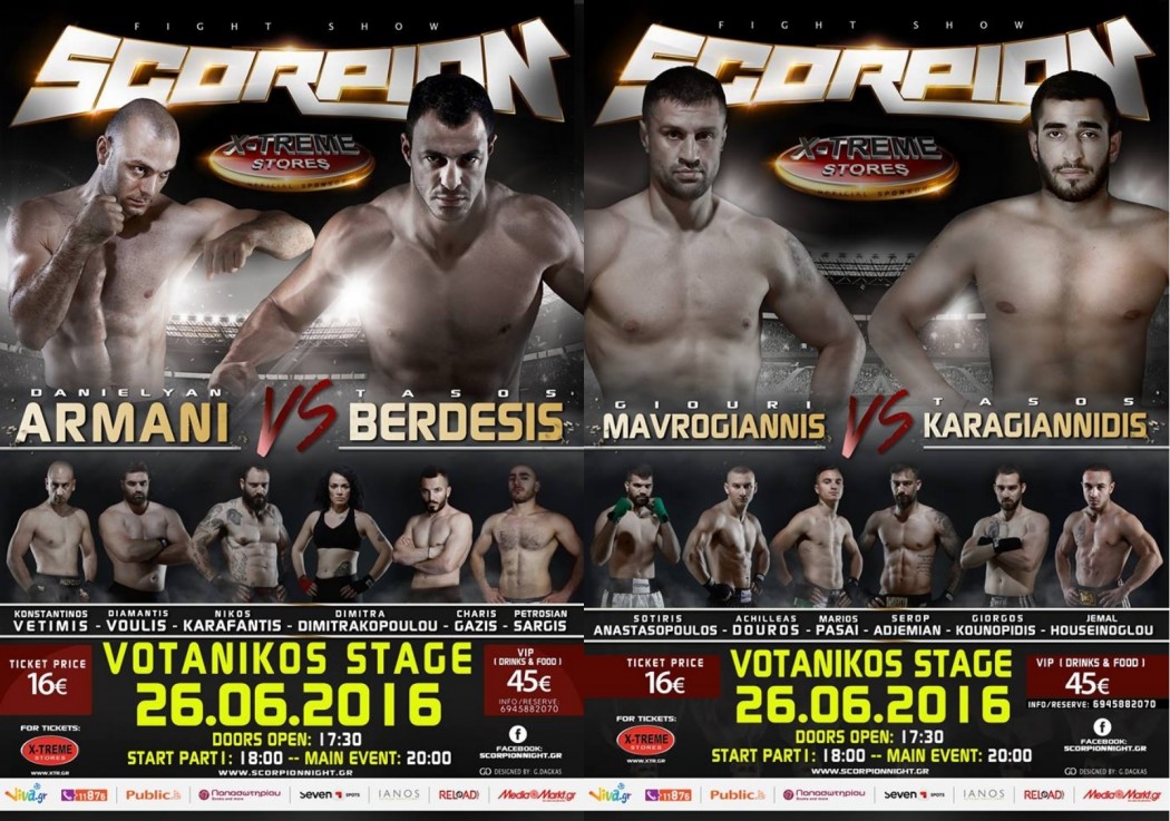 Την Κυριακή 26 Ιουνίου οι Μάριος Πασάι και ‘Αμπι Χοσένης θα ανέβουν στο ρινγκ του Scorpion Night, σε δύο αγώνες που περιμένουμε με μεγάλο ενδιαφέρον. Για τον Μάριο Πασάϊ είναι η επιστροφή του στα ρινγκ ένα χρόνο μετά την εντυπωσιακή νίκη του απέναντι στο Τσέλα Μάριο στο Iron Challenge, ενώ ο ‘Αμπι Χοσένης κάνει την πρώτη του εμφάνιση σε επαγγελματική διοργάνωση, πολύ καλά προετοιμασμένος και με στόχο, εκτός από μία καλή εμφάνιση, τη νίκη. Ο Μάριος Πασάι θα αγωνισθεί εναντίον του Nτούρου Αχιλλέα στα 70 Kg, ενώ ο Χοσένης Άμπι εναντίον του Κουνοπίδη Γεωργίου στα 75 Kg.