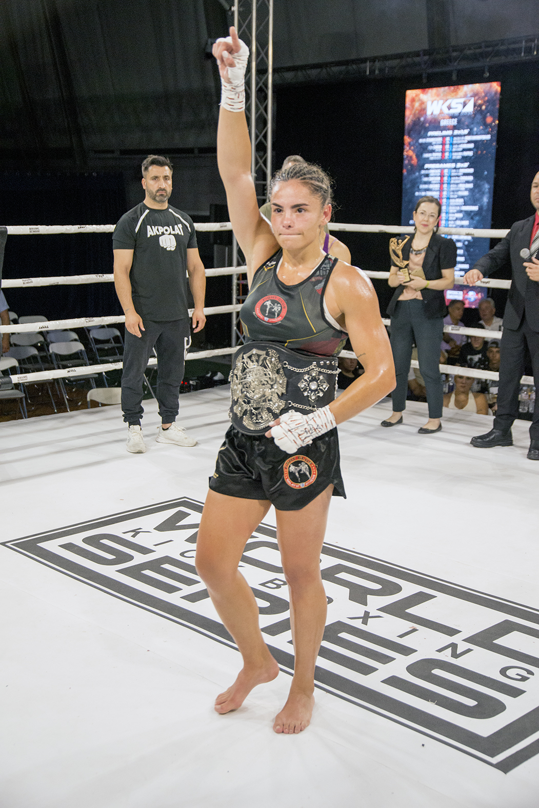 Εμφάνιση: Η «Panther» Αντωνία Πρίφτη επιβεβαίωσε την κλάση της στο main event, κυριαρχώντας σε όλο τον αγώνα και κλείνοντας με εντυπωσιακό φινάλε που ξεσήκωσε το κοινό.